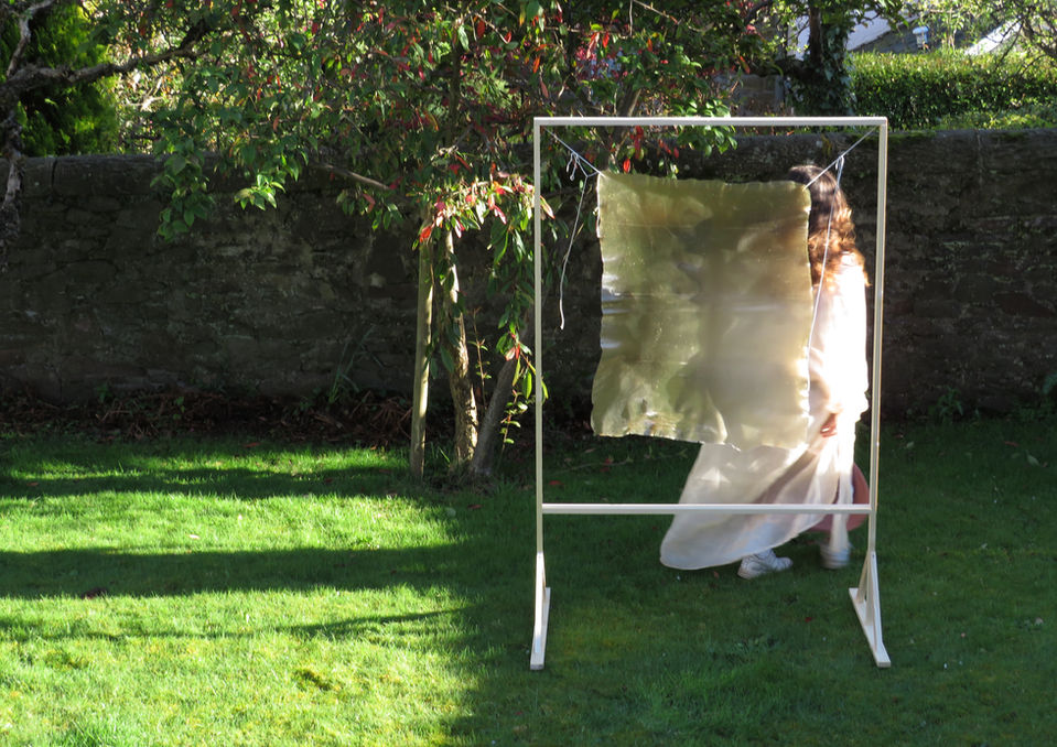 The translucent installations create distorted yet recognizable views of surroundings—flowers, landscapes, and human forms appear transformed yet present, mirroring how our perception of place is filtered through personal experience. Suspended in frames that separate yet connect, these bioplastic portals suggest that belonging may exist not in perfect integration but in the liminal space between observer and observed.